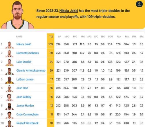 獨一檔,約基奇過去4個賽季砍下109次三雙,第二名小薩僅50次